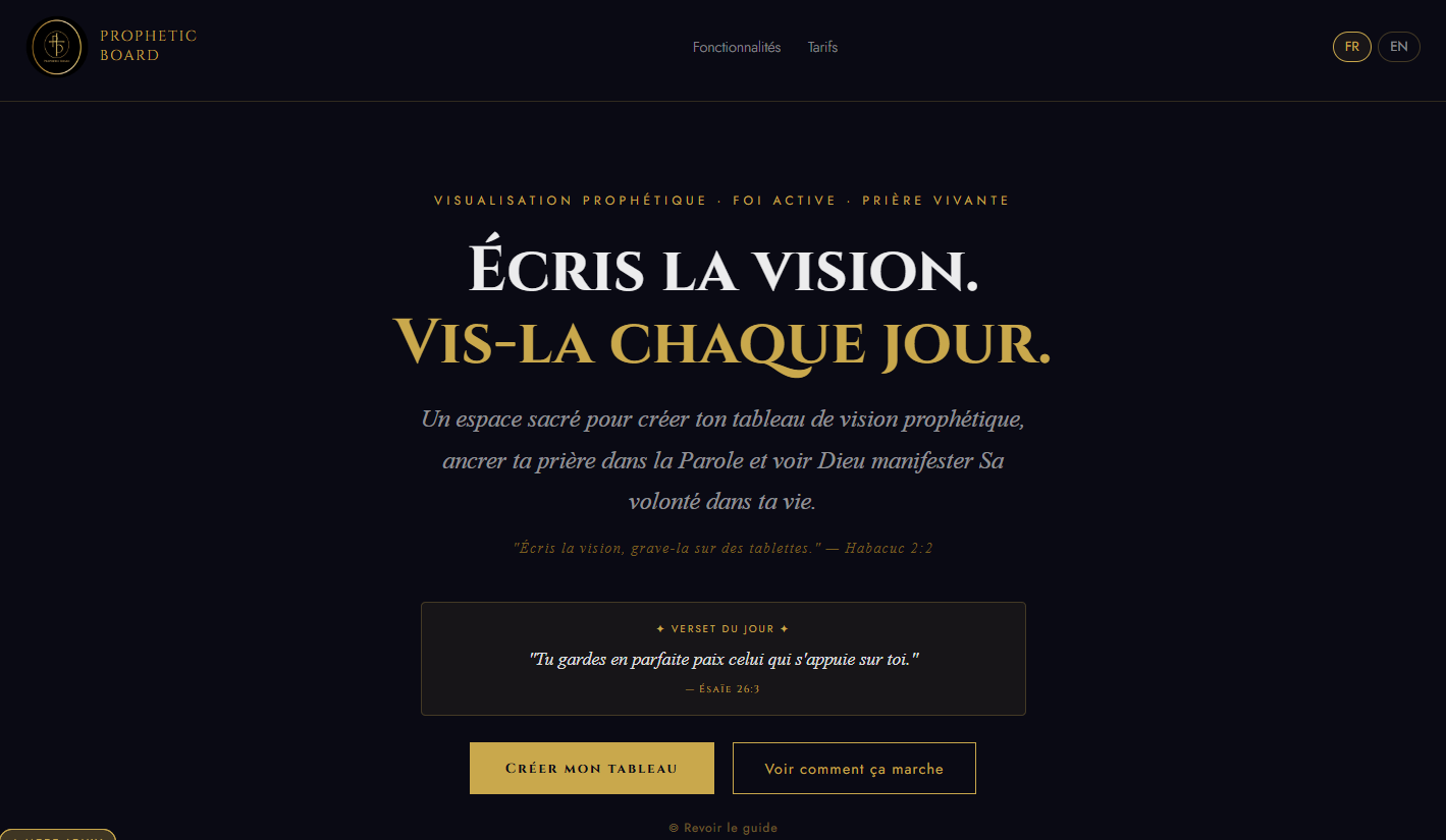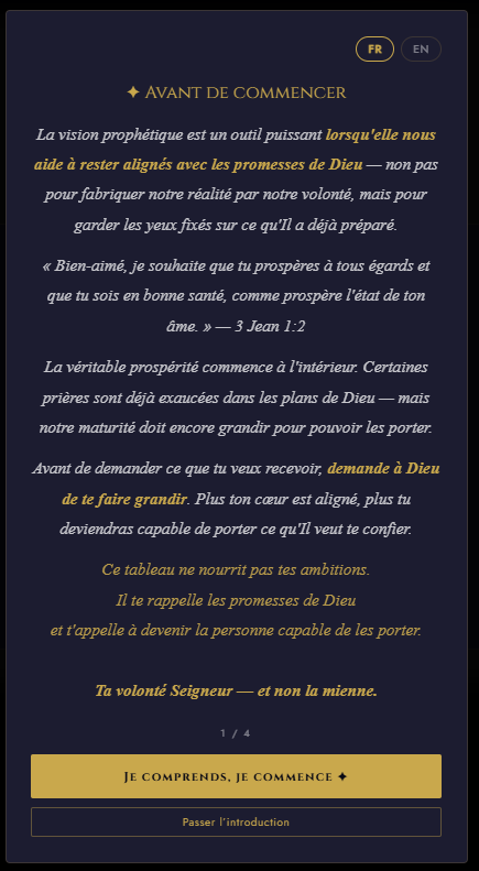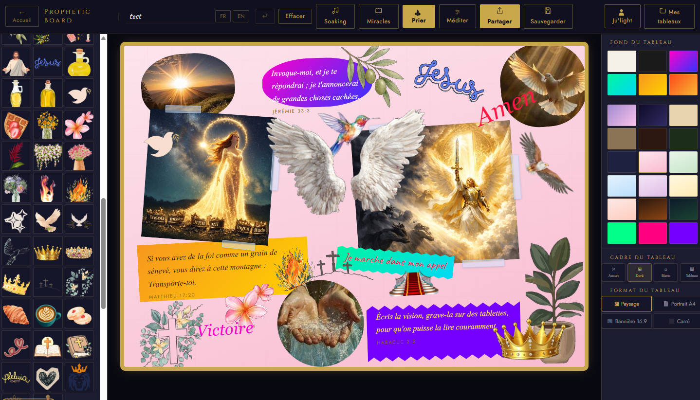Prophetic Board est un tableau de visualisation prophétique chrétien bilingue (FR/EN). Crée ton espace de prière visuel en ajoutant des versets bibliques, des photos personnelles, des mots d’encouragement et des autocollants spirituels.