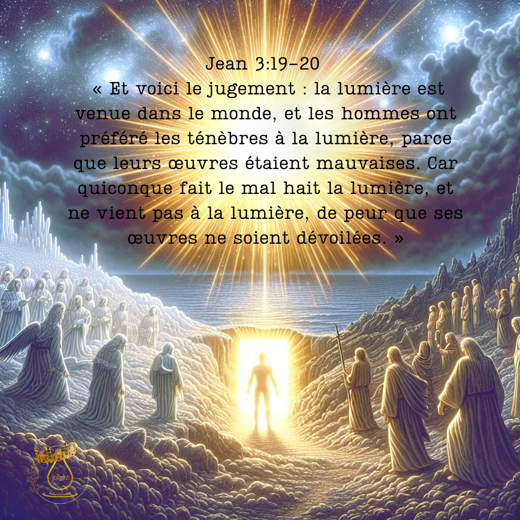 « Et voici le jugement : la lumière est venue dans le monde, et les hommes ont préféré les ténèbres à la lumière, parce que leurs œuvres étaient mauvaises. Car quiconque fait le mal hait la lumière, et ne vient pas à la lumière, de peur que ses œuvres ne soient dévoilées. »